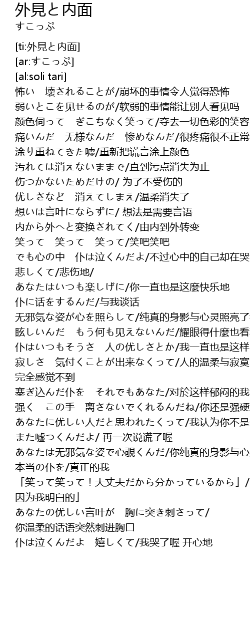 | [01:39.33] | でも心の中 仆は泣くんだよ/不过心中的自己却在哭泣 |
