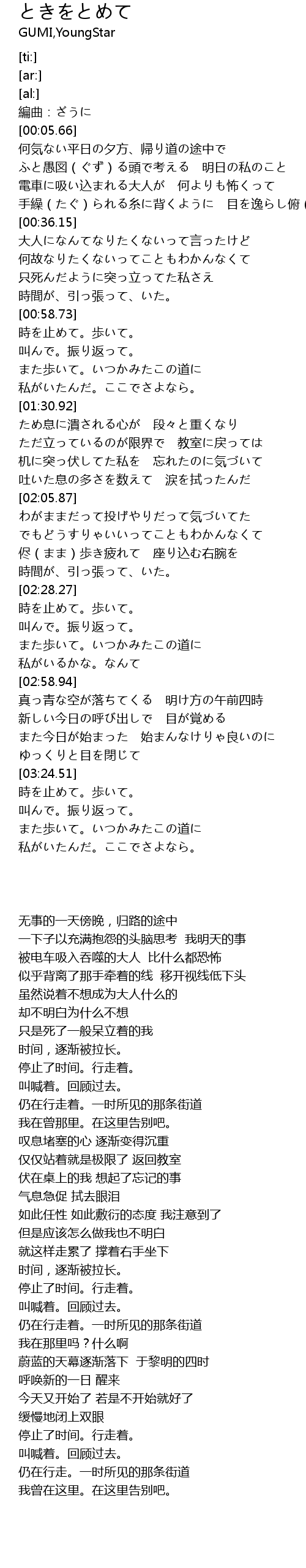 | [02:29.26] | 時を止めて。歩いて。 |