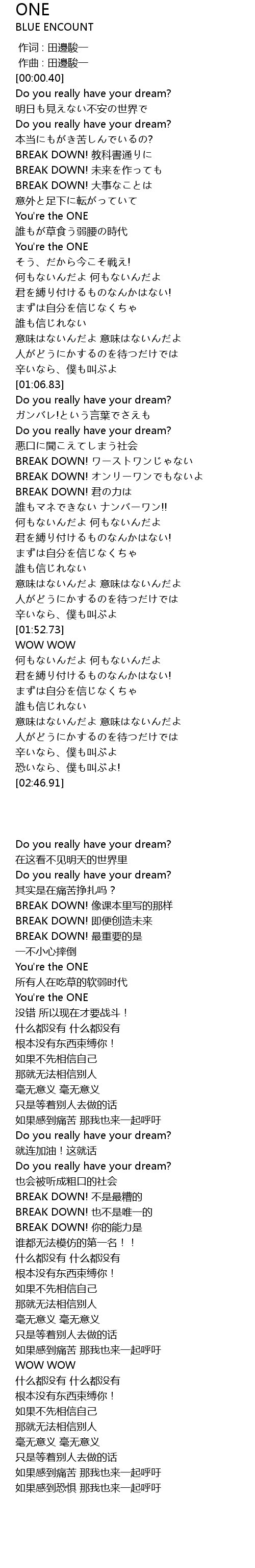 | [01:22.83] | BREAK DOWN! オンリーワンでもないよ |