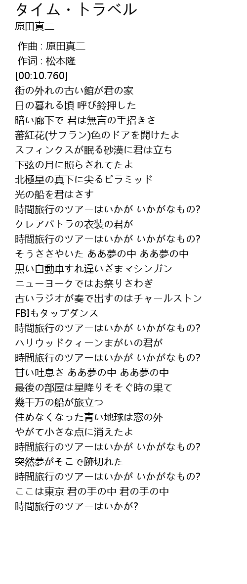 | [02:59.400] | 時間旅行のツアーはいかが いかがなもの? |