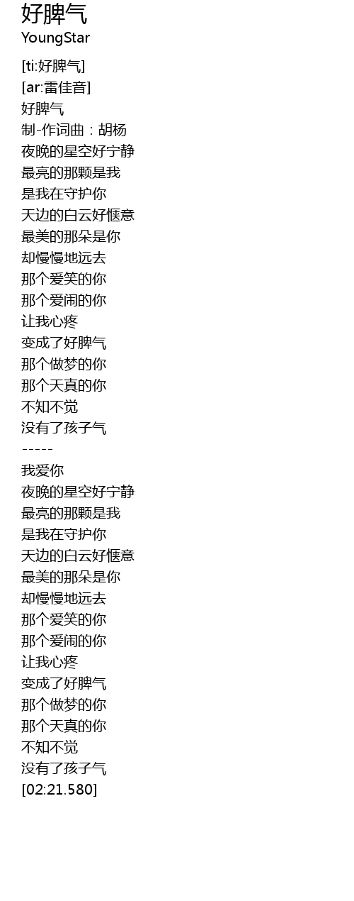 | [00:41.822] | biàn chéng le hǎo pí qì |