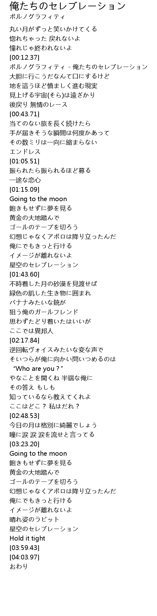 | [00:13.59] | ポルノグラフィティ - 俺たちのセレブレーション |