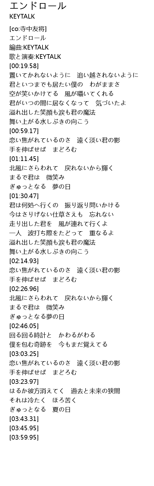 | [00:09.90] | 編曲:KEYTALK |