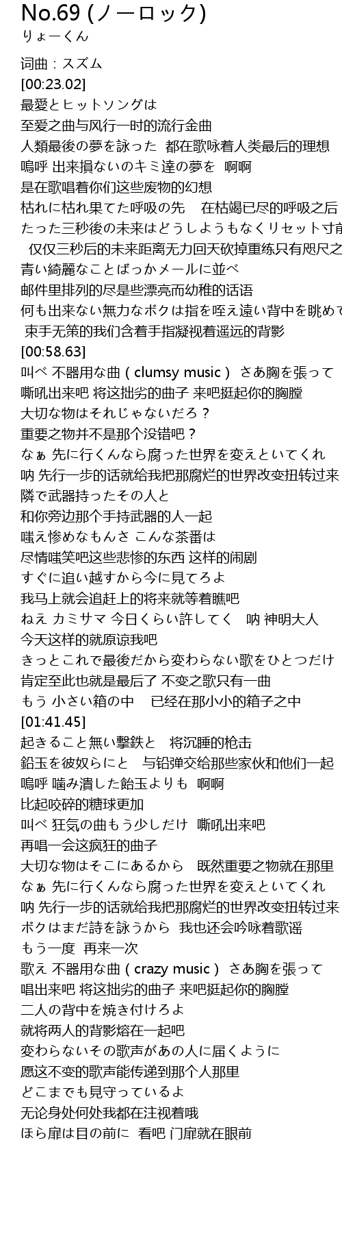 | [01:02.00] | 叫べ 不器用な曲(clumsy music) さあ胸を張って 嘶吼出来吧 将这拙劣的曲子 来吧挺起你的胸膛 |