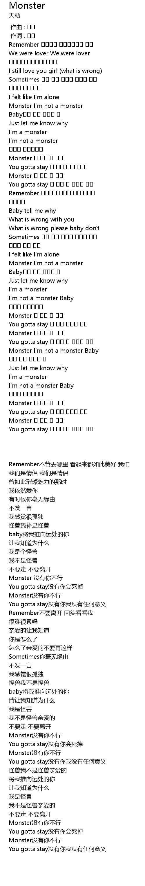 | [03:04.53] | Monster 너 없는 난 안돼 |