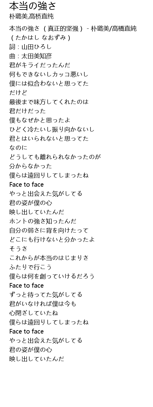 | [00:00.141] | 本当の強さ (真正的坚强) - 朴璐美/高橋直純 (たかはし なおずみ) |