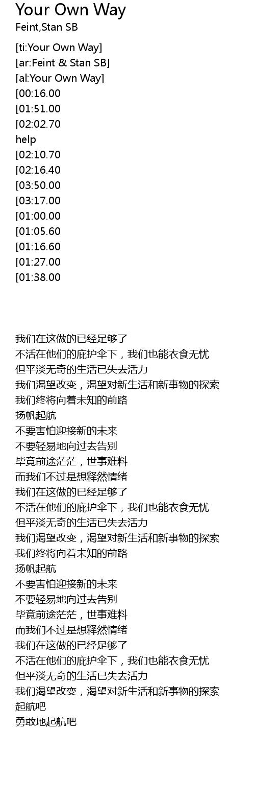 | [03:44.70][02:16.40][00:48.00] | A better place or something new to do |