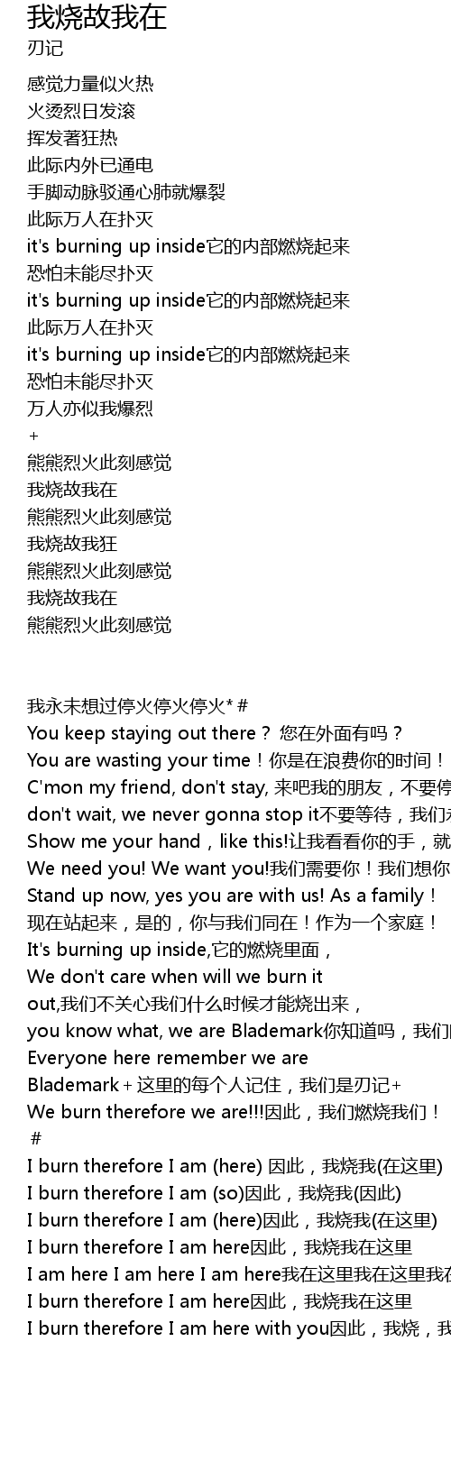 | I burn therefore I am here with you yīn cǐ, wǒ shāo, wǒ zài zhè lǐ yǔ nǐ |