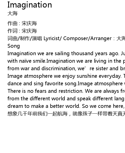 | Imagination we are sailing thousand years ago. Just like those merry children, with na ve smile. Imagination we are living in the peaceful world. Keep away from war and discrimination, we' re sister and brother. | |