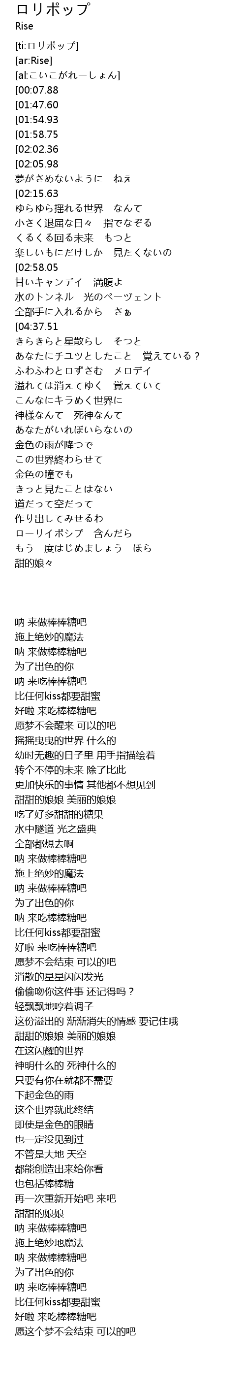 | [00:15.46][01:58.75][04:26.45] | ねえ 食べよう ローリイポップ |