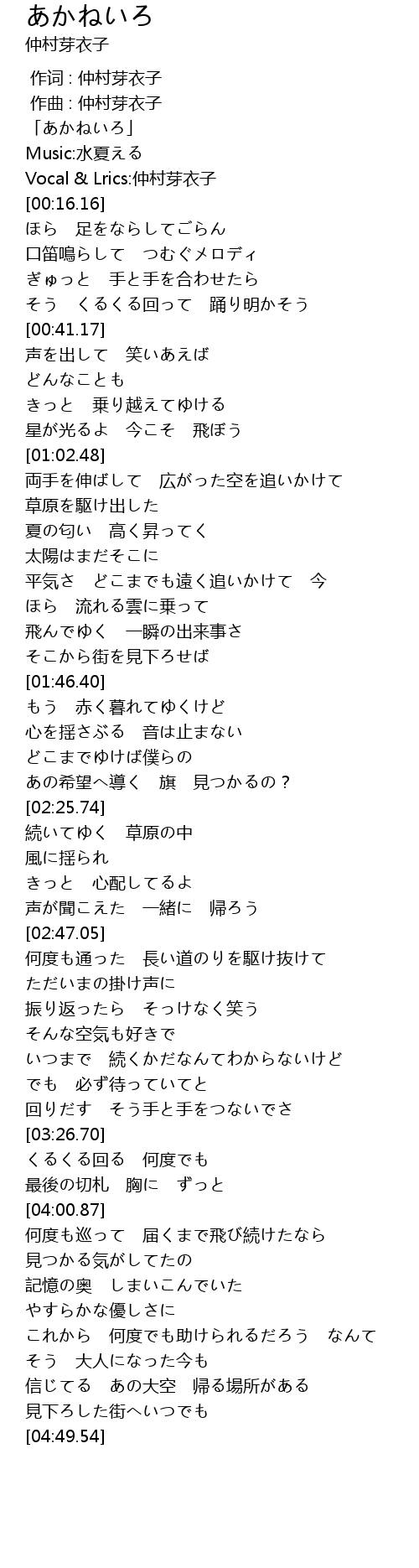 | [00:11.47] | Vocal & Lrics:仲村芽衣子 |