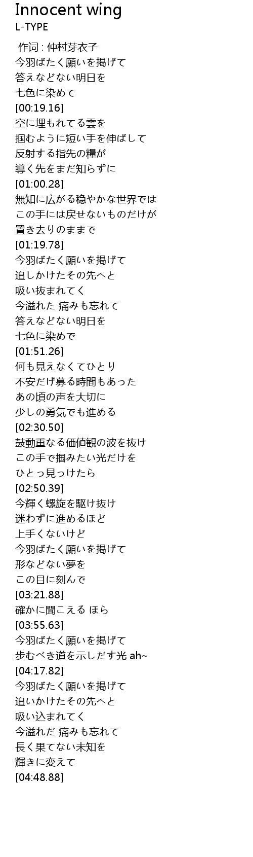 | [04:18.10] | 今羽ばたく願いを掲げて |
