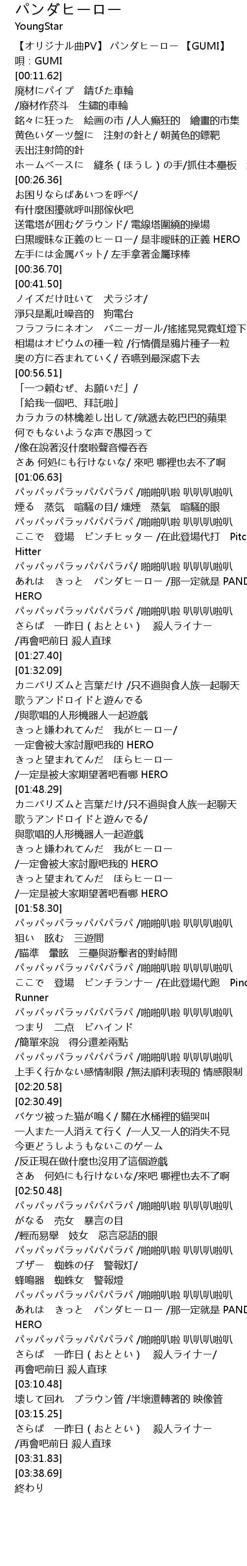 | [00:01.05] | 【オリジナル曲PV】 パンダヒーロー 【GUMI】 |