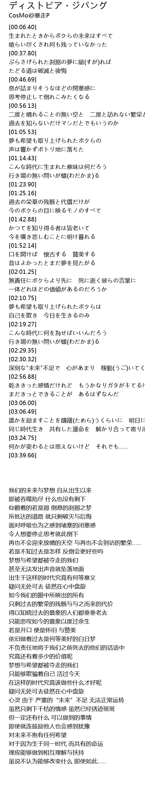 | [03:06.80] | 誰かを励ますことを躊躇(ためら)うくらいに 明日に希望は抱けないけれど |