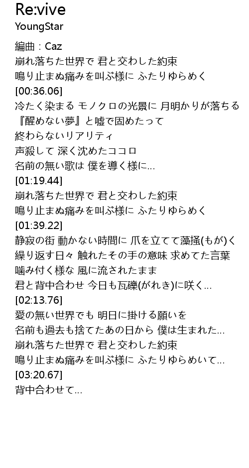 | [03:11.35] | 鳴り止まぬ痛みを叫ぶ様に ふたりゆらめいて… |
