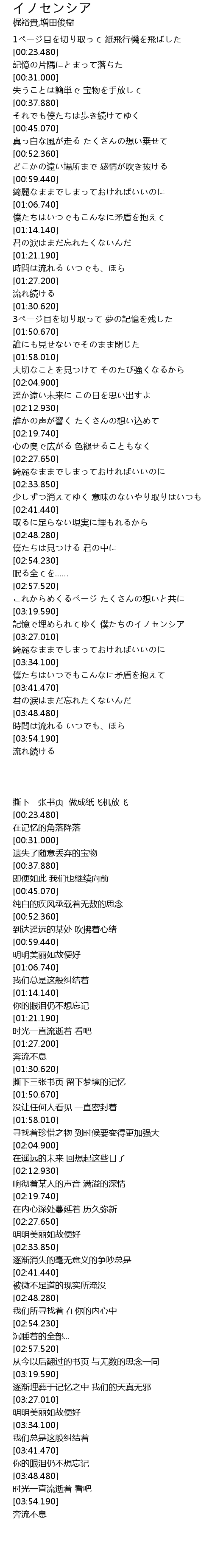| [03:20.320] | 記憶で埋められてゆく 僕たちのイノセンシア |