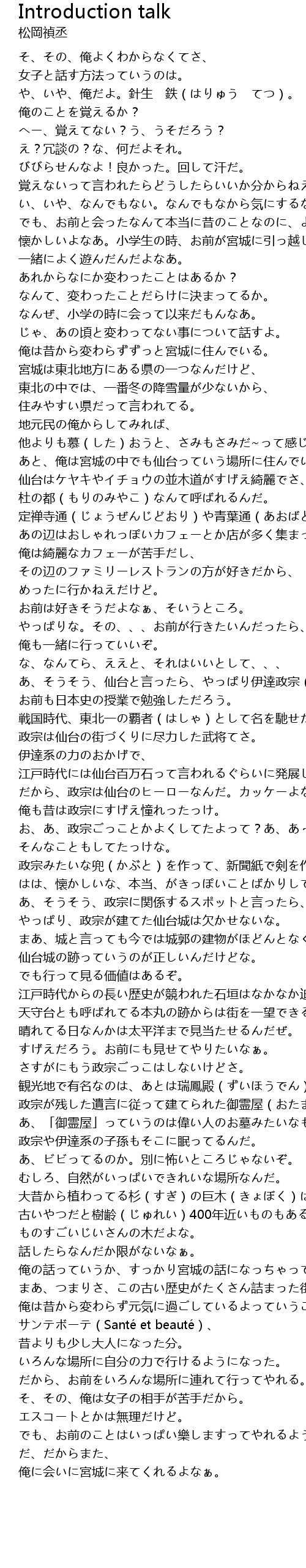 | [02:46.35] | あ、そうそう、仙台と言ったら、やっぱり伊達政宗(だて まさむね)だよな。 |