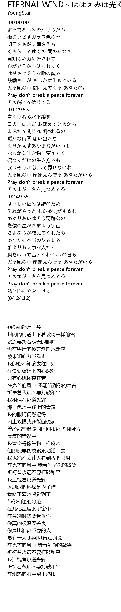 | [03:59.88] | Pray don' t break a peace forever |
