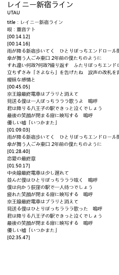 | [01:19.10] | 雨が降る新宿歩いてく ひとりぼっちエンドロール間近 |