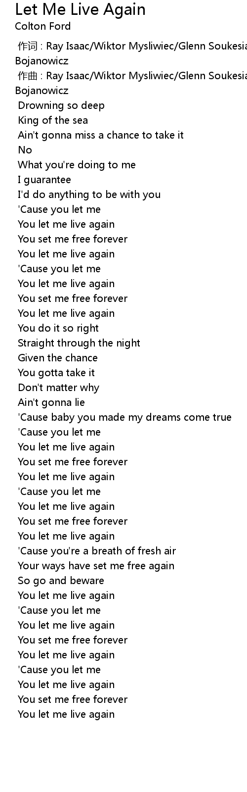 | [00:00.000] | 作词 : Ray Isaac/Wiktor Mysliwiec/Glenn Soukesian/Mikael Bojanowicz |