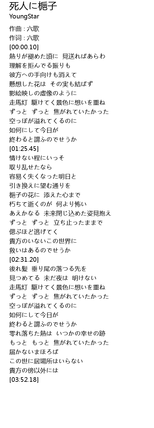 | [00:52.79] | 懸想した花は その実も結ばず |