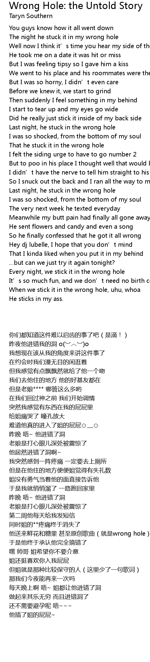 | [00:08.30] | The night he stuck it in my wrong hole |