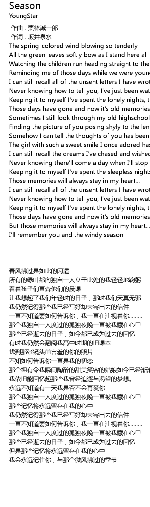 | [02:22.96] | Keeping it to myself I've spent the sleepless nights; that season |