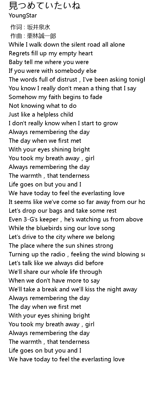 | [02:45.12] | Even 3G' s keeper, he' s watching us from above |