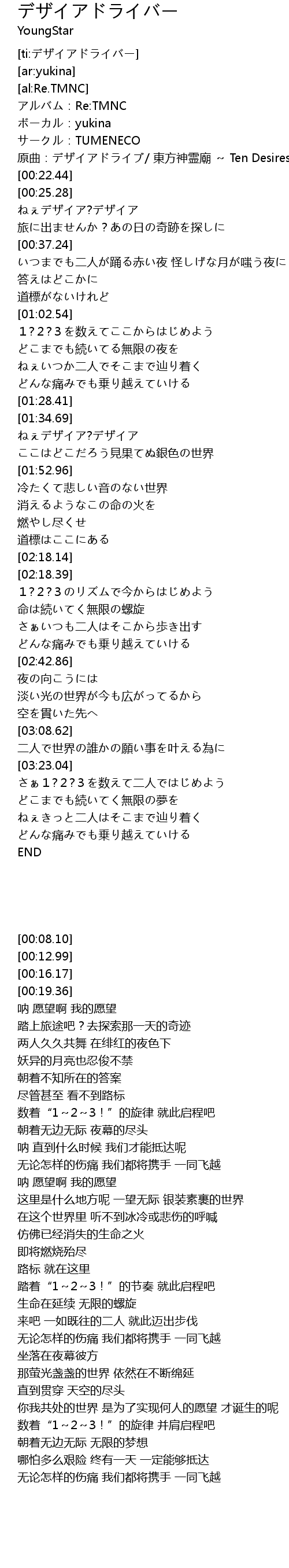 | [00:19.36] | 原曲:デザイアドライブ/ 東方神霊廟 ~ Ten Desires. |