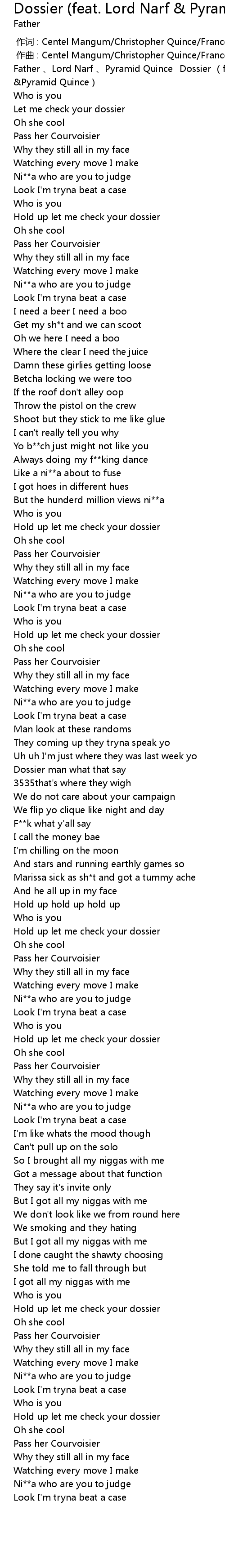 | [00:00.24] | Father 、Lord Narf 、Pyramid Quince -Dossier (feat.Lord Narf &Pyramid Quince) |