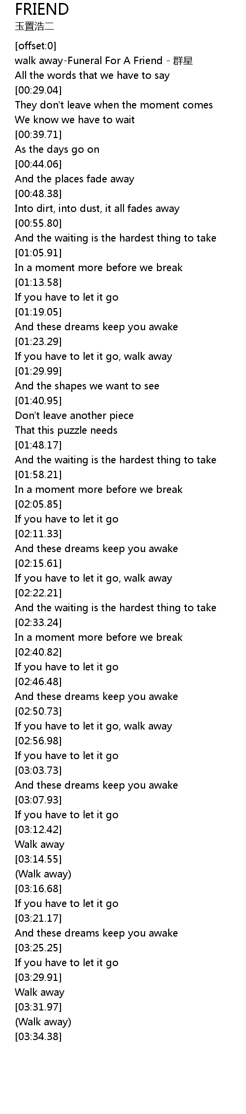 | [00:00.57] | walk away-Funeral For A Friend - 群星 |