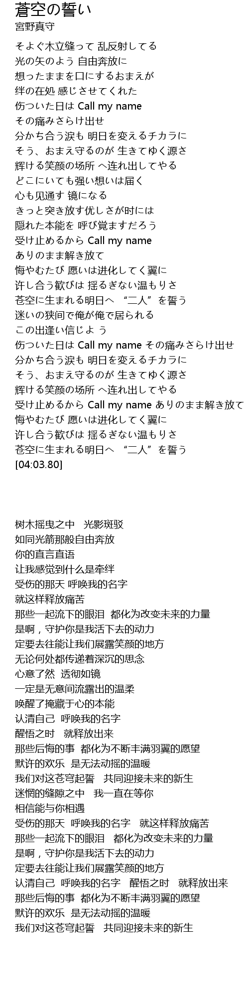 | [03:24.79] | 苍空に生まれる明日へ “二人”を誓う |