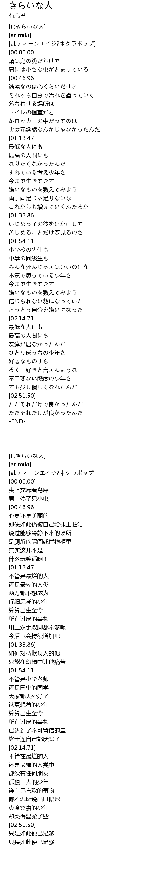 | [01:59.72] | みんな死んじゃえばいいのにな |