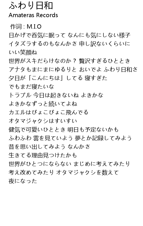 | [00:54.76] | アナタもまにまにゆるりと おいでよ ふわり日和さ |