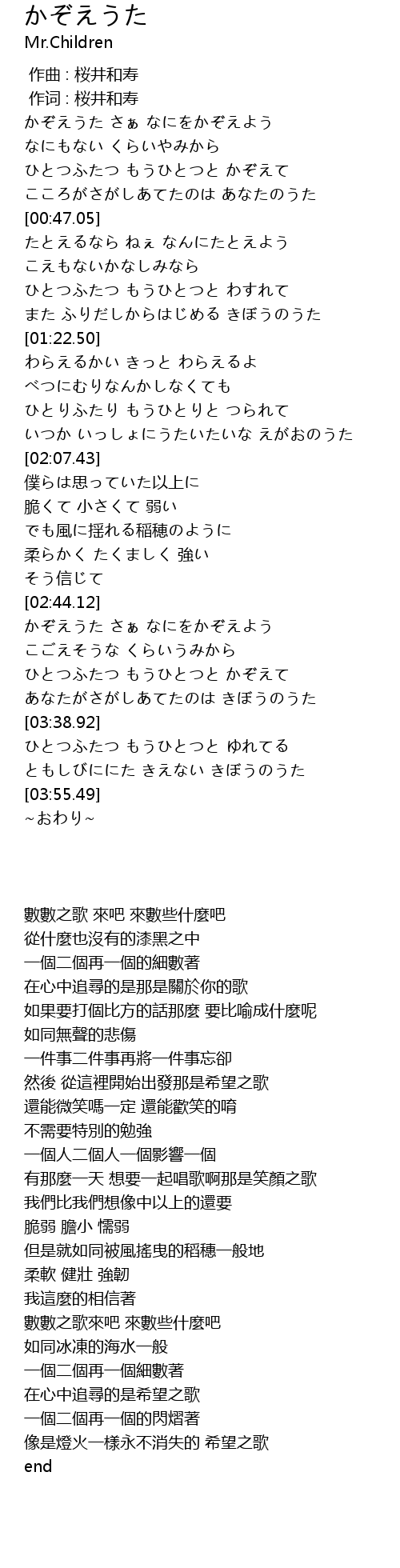 | [00:15.75] | かぞえうた さぁ なにをかぞえよう |