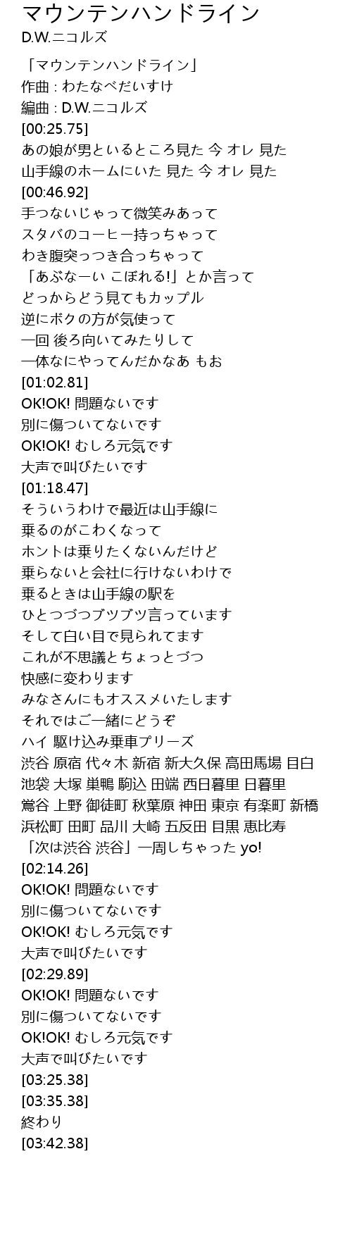 | [01:51.04] | 渋谷 原宿 代々木 新宿 新大久保 高田馬場 目白 |