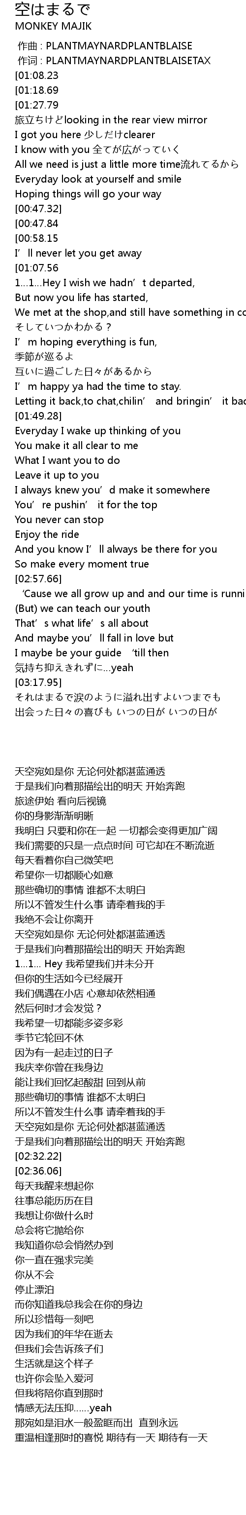 | [02:10.76][01:08.23][00:05.89] | 空はまるで君のように青く澄んでどこまでも |