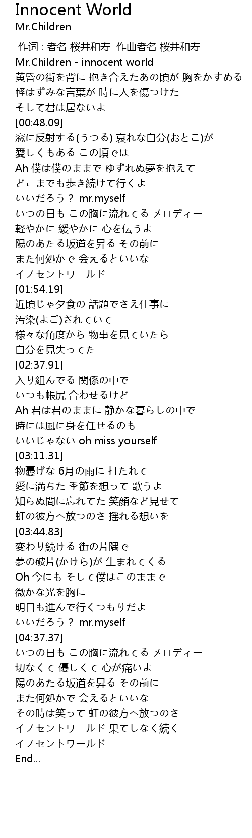 | [05:16.17] | イノセントワールド 果てしなく続く |
