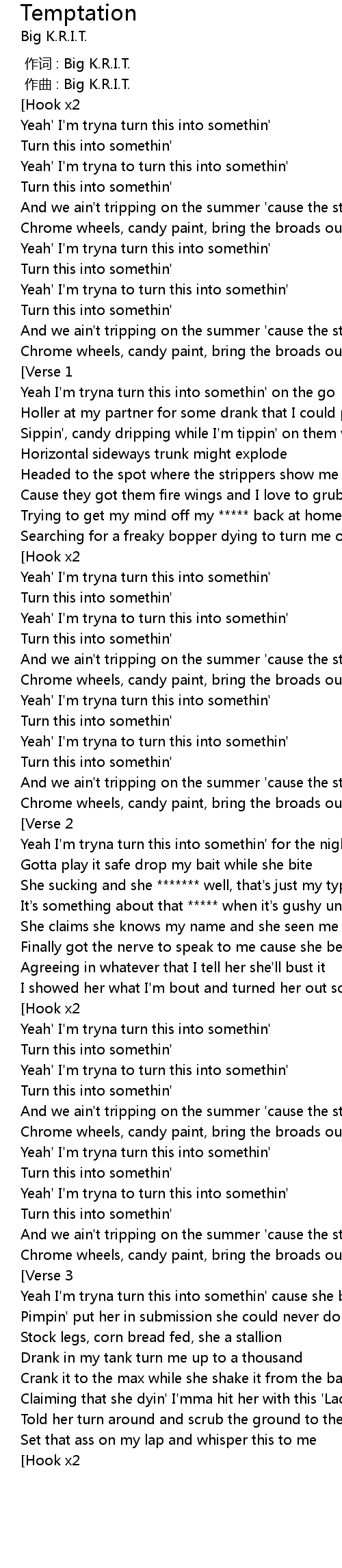 | [00:03.905] | Yeah' I' m tryna to turn this into somethin' |