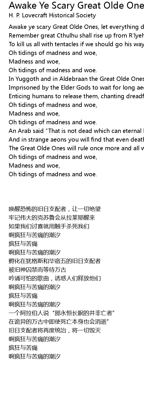 | [0:05.000] | Awake ye scary Great Olde Ones, let everything dismay. |