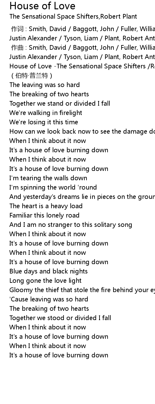 | [00:00.00] | House of Love The Sensational Space Shifters Robert Plant bó tè pǔ lán tè |
