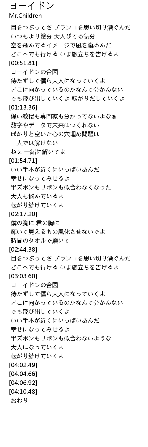 | [00:55.32] | 待たずして僕ら大人になっていくよ |