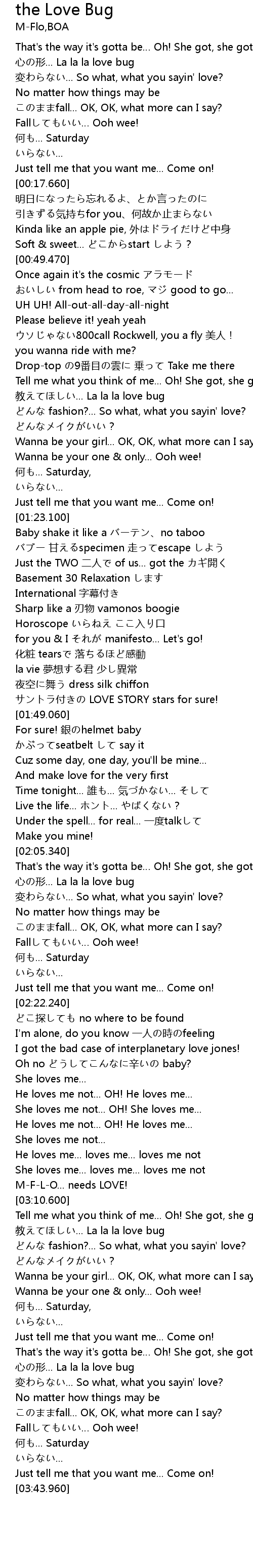 | [03:12.890] | 教えてほしい... La la la love bug |