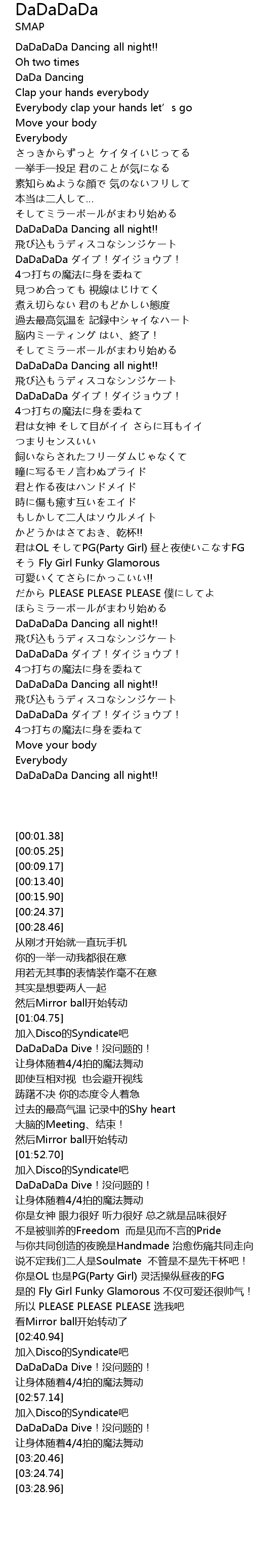 | [03:28.96] | DaDaDaDa Dancing all night!! |