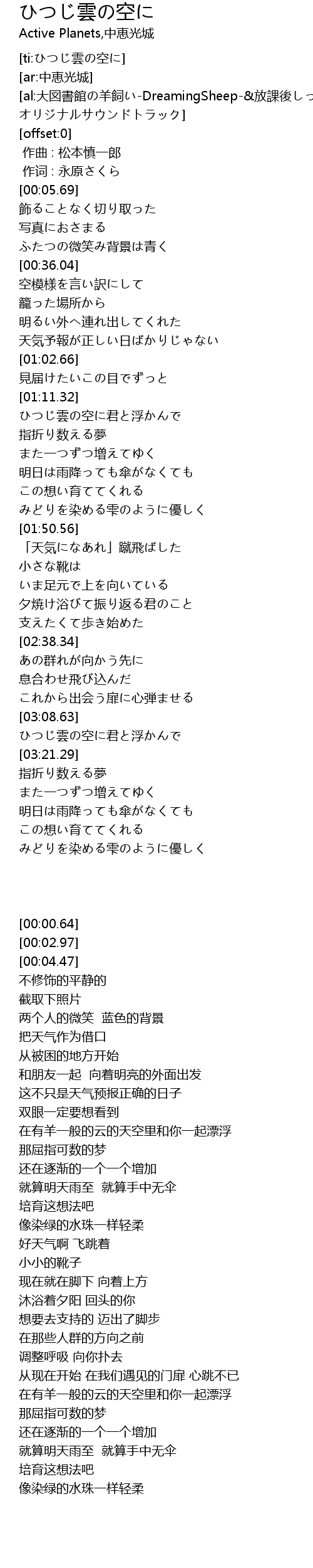 | [01:12.70] | ひつじ雲の空に君と浮かんで |