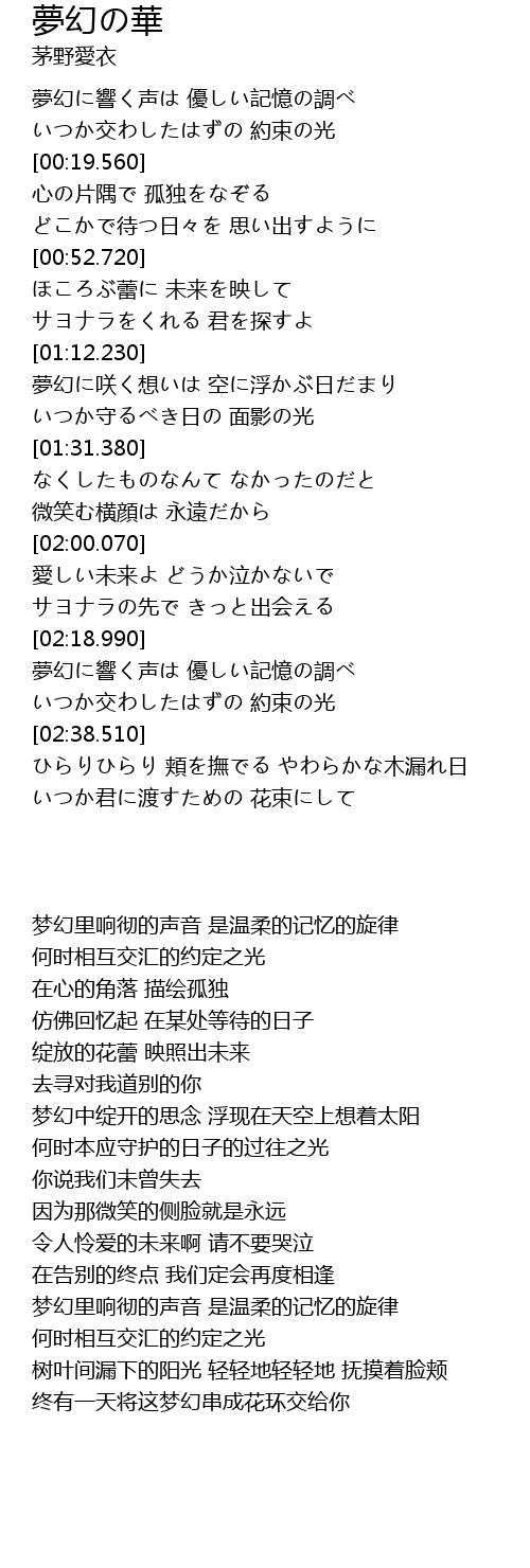 | [00:00.940] | 夢幻に響く声は 優しい記憶の調べ |