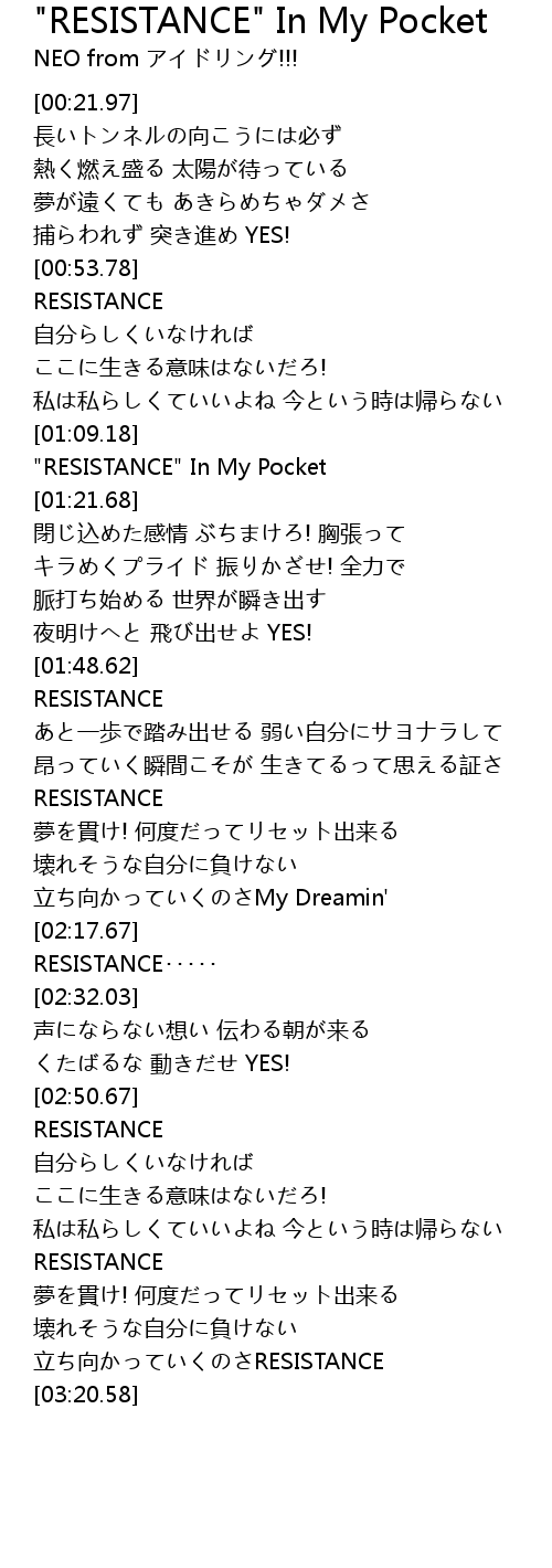 | [01:19.94] | "RESISTANCE" In My Pocket |