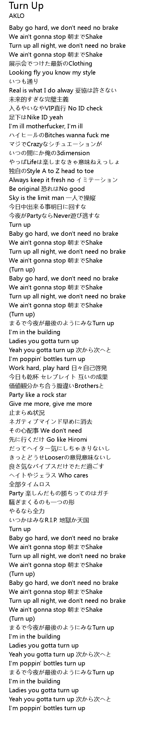 | [00:17.430] | Turn up all night, we don't need no brake |