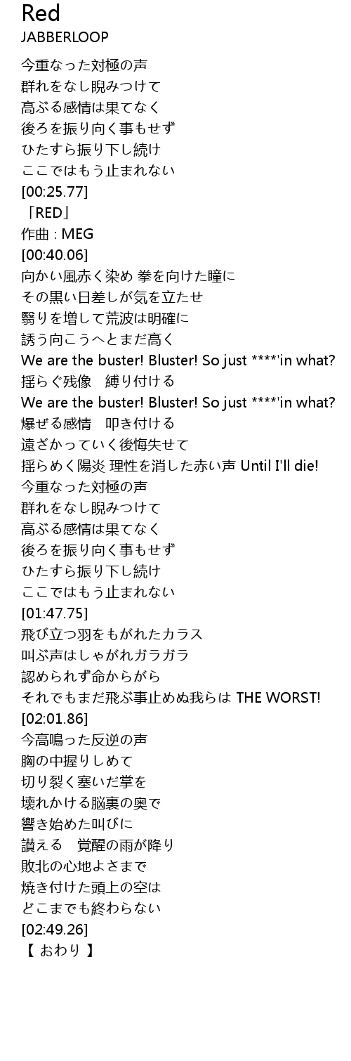| [01:02.25] | We are the buster! Bluster! So just ****'in what? |