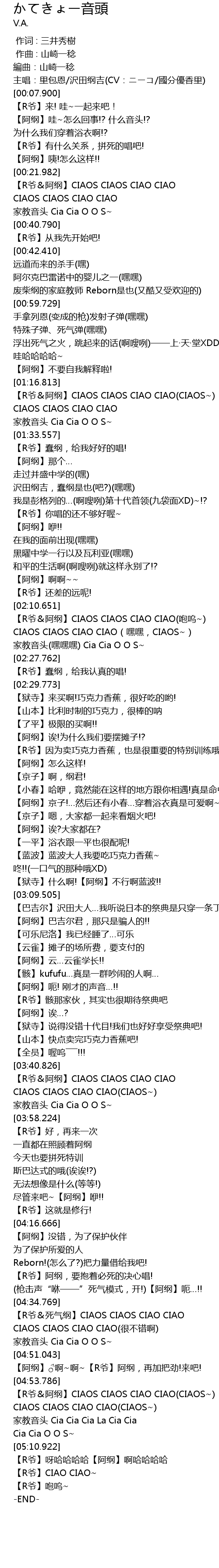 | [02:10.651] | 【R爷&阿纲】CIAOS CIAOS CIAO CIAO(咆呜~) |